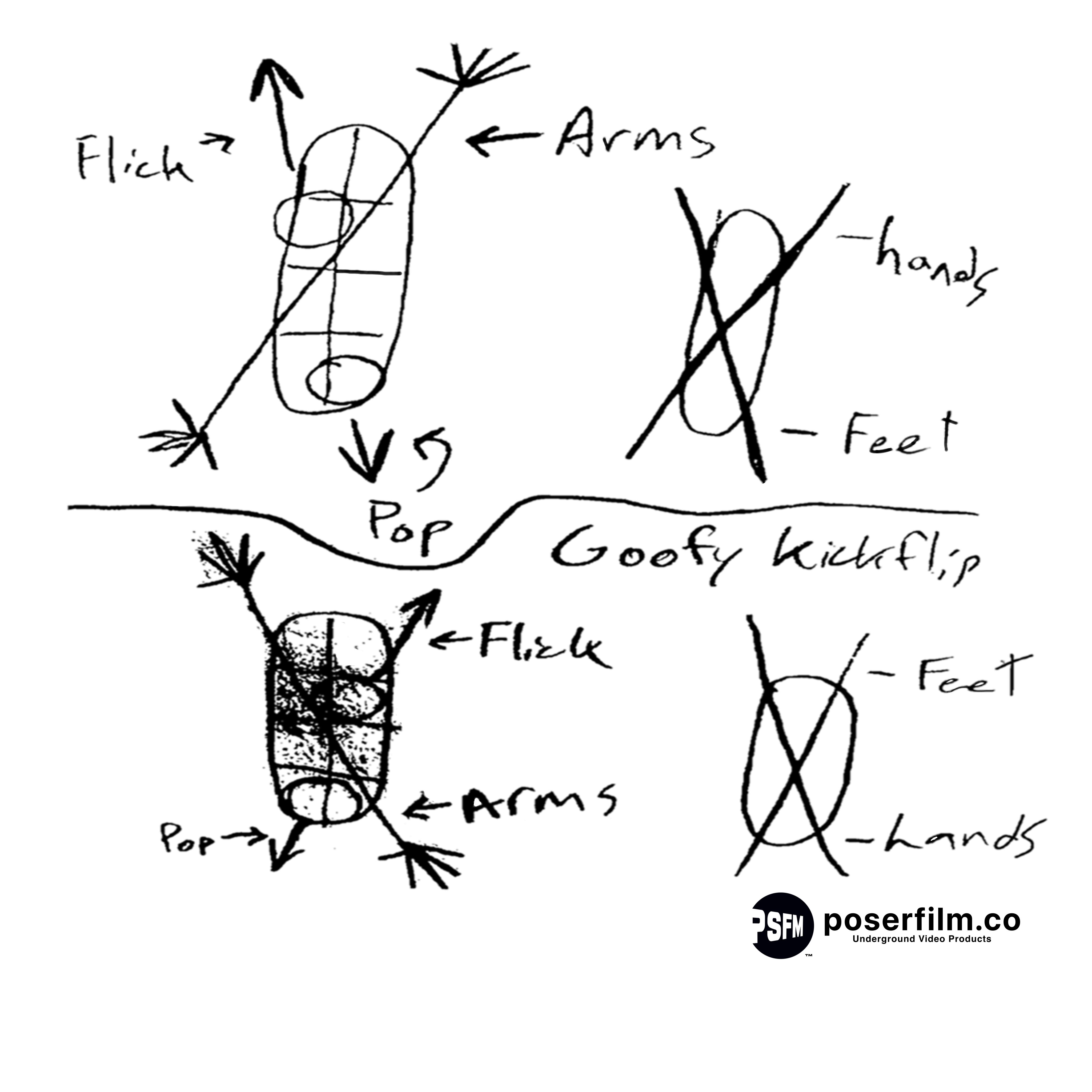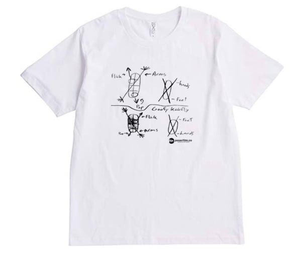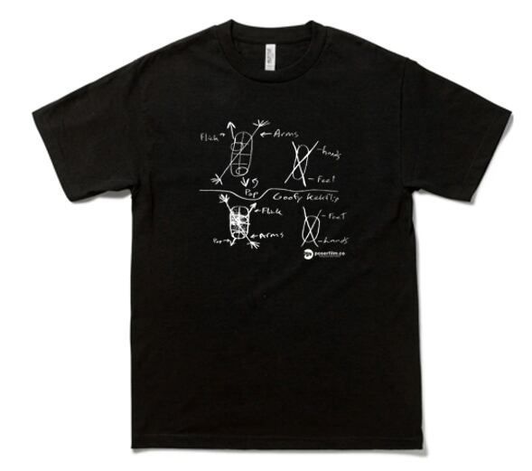 本Tシャツのデザインは、キックフリップの動作を解剖学的観点から簡略化し、手描きのスケッチとして記録したものを基に構築された。特に、デッキのフリック(flip)、足の動作(foot movement)、アームバランス(arm positioning)に着目し、それぞれの要素を視覚的に整理することを目的とする。